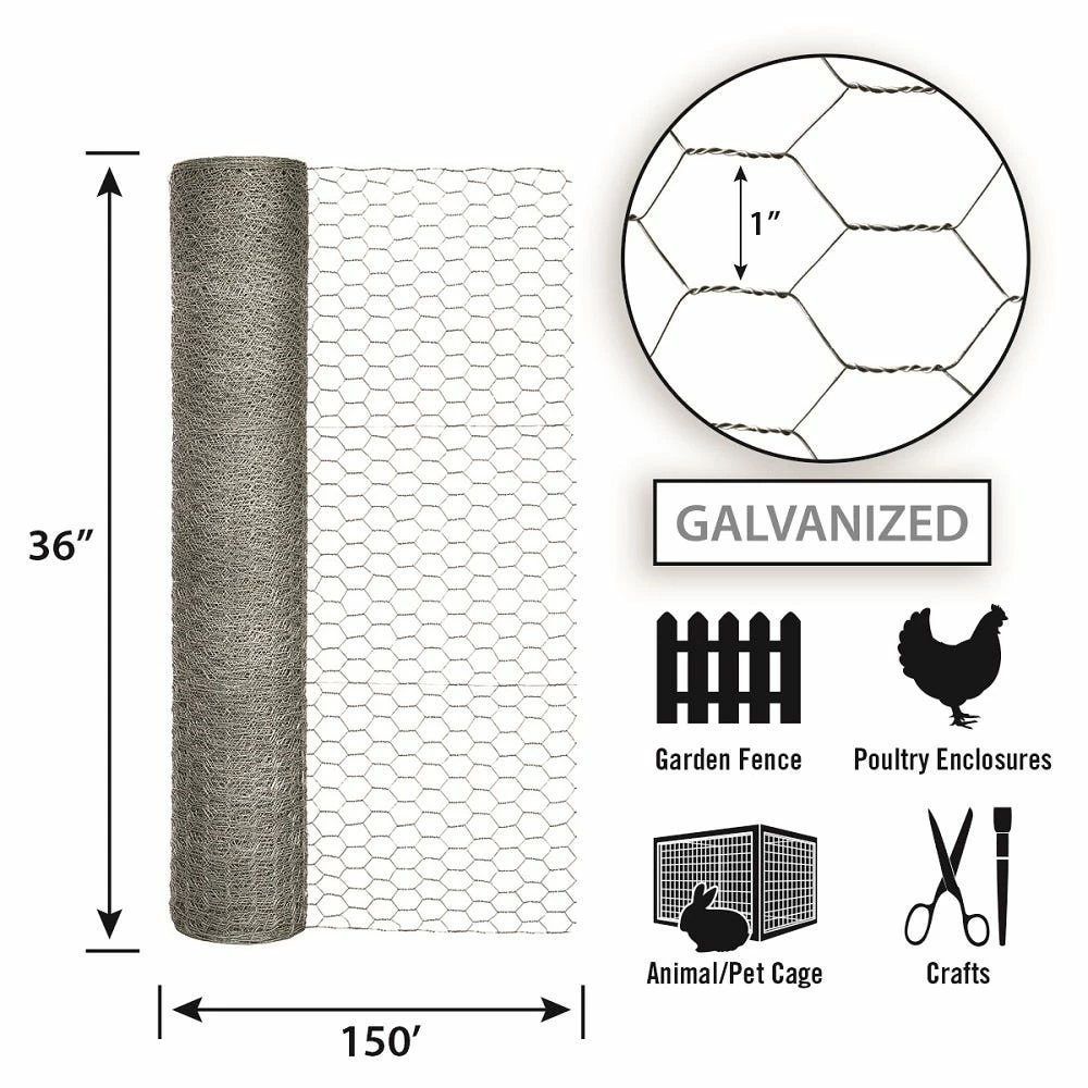 36in H x 150ft W Galvanized Hex Netting features a 1in hexagonal mesh weave design and is both lightweight and easy to use. The hex netting is galvanized with a zinc coating for added durability and to help prevent rusting. Chicken wire has many uses such as animal containment, plant protection and support, fencing applications, and many more.