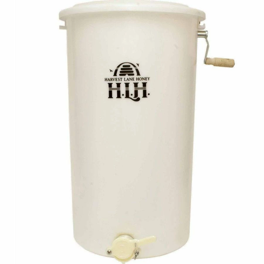 Harvest Lane Honey Extractor (plastic). Food grade plastic with hand crank system. Use 2 frames (works with most standard sizes). Honey gate in the front to allow honey to flow or be contained during extraction. Steel and plastic components. Durable. Easy care.