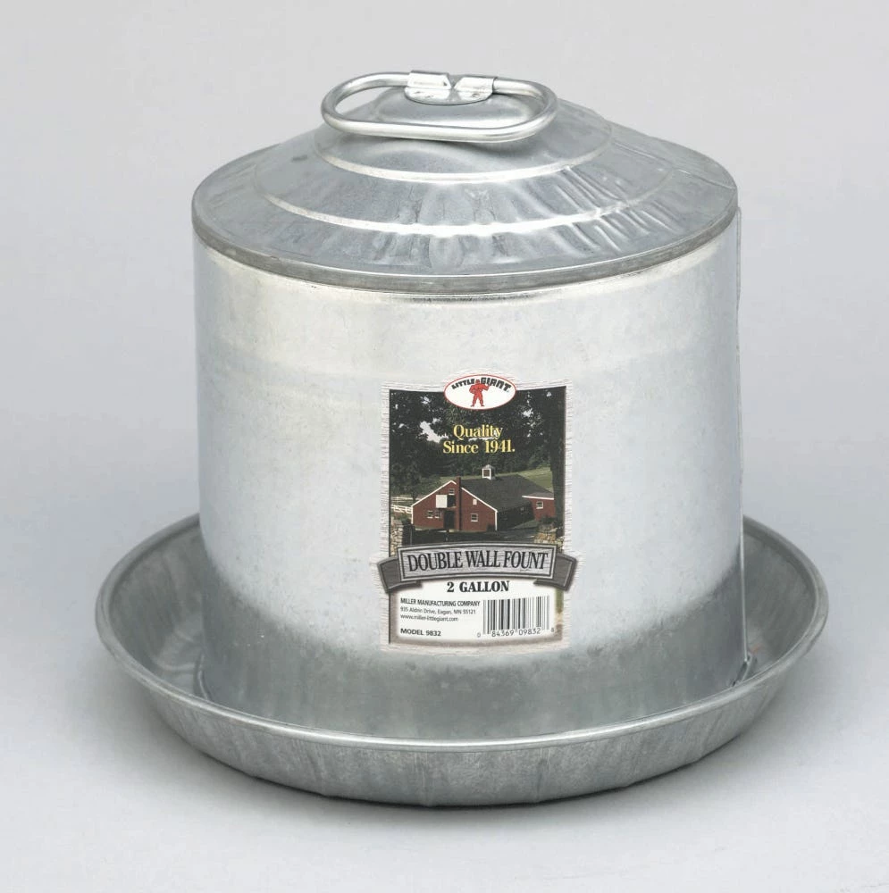 A heavy-duty standalone waterer for chickens, turkeys, and other poultry. Double-wall construction features an inner tube with a strong arched handle for carrying the filled fount and an outer tube with its own handle for convenience. When the outer tube is inserted over the inner tube, a copper spring and neoprene seal create a vacuum to maintain a constant water level in the drinking pan. Features a locking pin to hold the outer tube in place. Sloped top prevents roosting. Constructed of heavy-gauge galvanized steel with rolled edges for safety. Seams are constructed and tested to prevent leaks. A key advantage of metal founts is the ability to use the fount in winter with a heater base such as the Little Giant Electric Water Heater Base (Item No. HB130, sold separately). This is not a hanging water; must be placed on the ground or floor. 12.25 inch diameter by 10.75 inch high, holds 2 gallons.