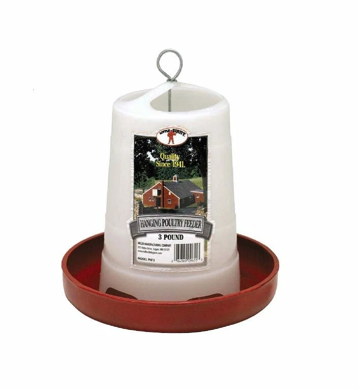 This is a great economy-priced Hanging Poultry Feeder designed exclusively for the hobbyist. Smaller size is perfect for chicks and baby quail. Attached metal hanging bracket included. Made of impact-resistant plastic that won’t rust or corrode. 8.25 inch diameter by 8.75 inch high, holds 3 pounds of feed.