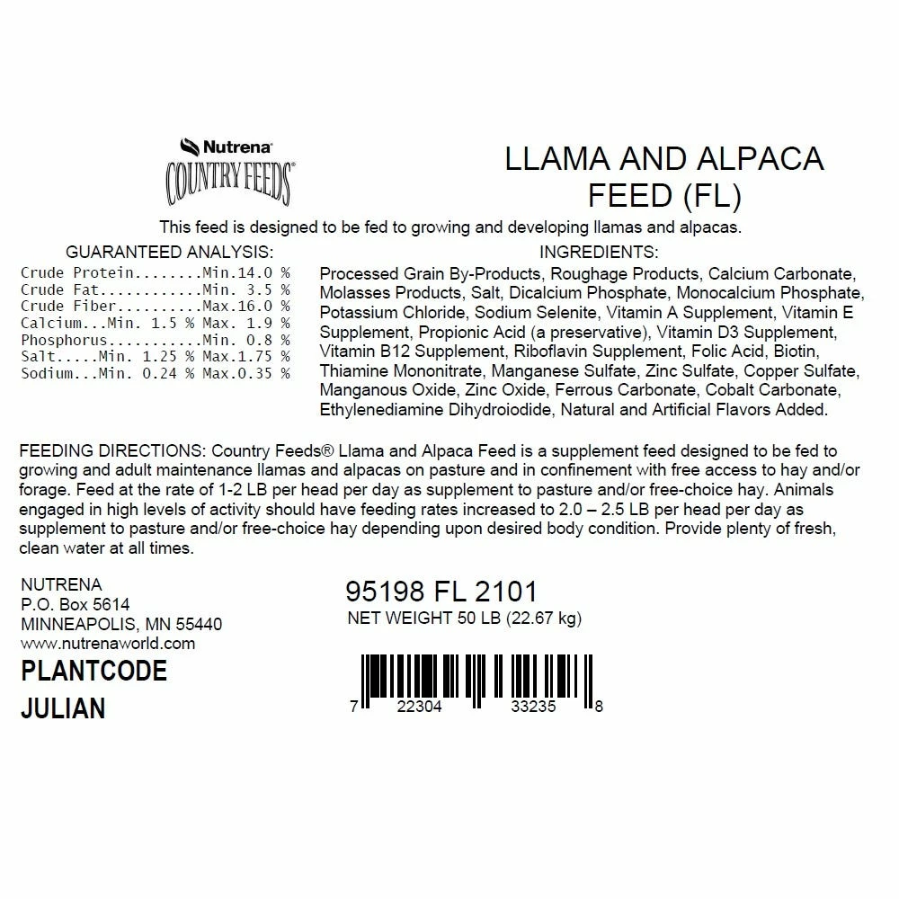 - Country Feeds® Llama and Alpaca Feed is a supplement feed designed to be fed to growing and adult maintenance llamas and alpacas on pasture and in confinement with free access to hay and/or forage.