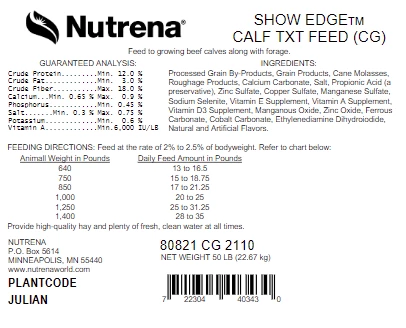 - At the start of the feeding period, fill calves on hay and gradually introduce Show Edge Show Calf Feed over time, starting with 2-3 lbs on the first day. Divide into two equal feedings.