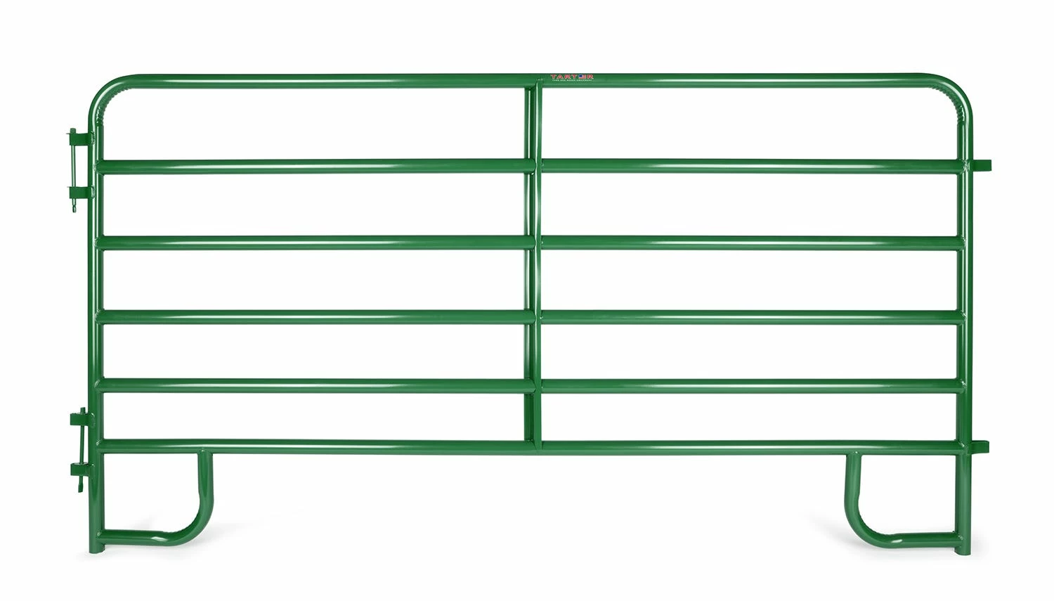 Tarter’s 6-Bar Economy Corral Panel is ideal for light to medium confinement of livestock in round pens and working areas. Constructed of 1-3/4″ round high-tensile strength steel tubing with continuous-welded saddle joints and Z braces for superior longevity in the field. Custom loop legs prevent sinking in soft surfaces and corrals are easily installed with the quick-pin latch system.