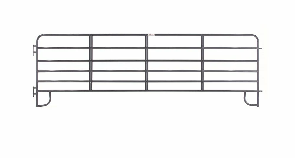 Tarter’s 6-Bar Economy Corral Panel is ideal for light to medium confinement of livestock in round pens and working areas. Constructed of 1-3/4″ round high-tensile strength steel tubing with continuous-welded saddle joints and Z braces for superior longevity in the field. Custom loop legs prevent sinking in soft surfaces and corrals are easily installed with the quick-pin latch system.