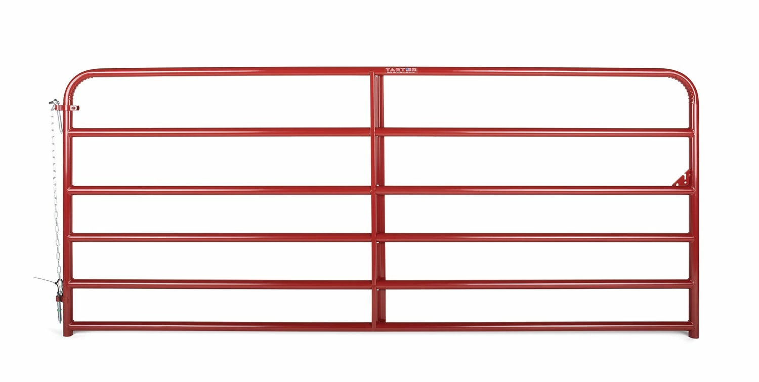 Tarter’s 6-Bar Economy Tube Gate is the perfect gate for access between pastures and entry ways. This gate stands 50″ high with vertical Z braces and is constructed of 1-3/4″ high tensile strength tubing. Featuring continuous-welded saddle joints and our durable, corrosion resistant powder-coat finish for superior longevity. Available in 4′ – 20′.