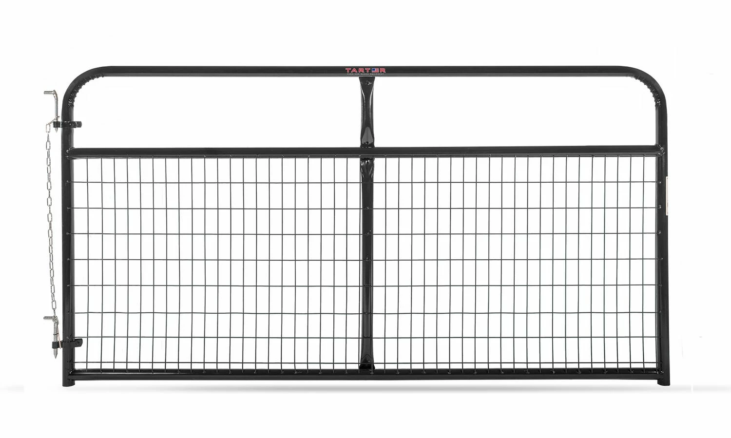 Tarter’s Watchmen Wire Mesh Gate provides secure confinement options for horses and smaller livestock, utilizing 8 gauge, 2”x4” wire mesh. This gate features 1.75” steel tubing and a long-lasting corrosion-resistant finish. This gate comes ready to hang with hinge pins that are adjustable so the gate can open on either side. A snap chain is also included.