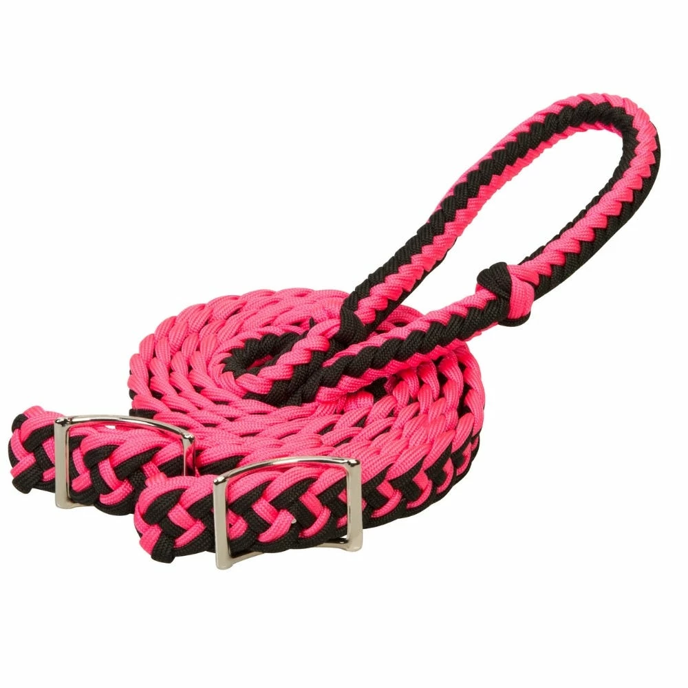 These 1″ flat end braided nylon barrel reins feature easy grip knots for a secure feel in the hands. Nickel plated conway buckle bit ends. Measure 1/2″ x 8′ (1″ wide 32″ back from bit ends).