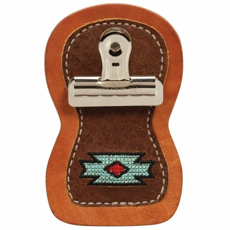 - Brown leather holder features a crocodile print overlay and a nickel-plated clip