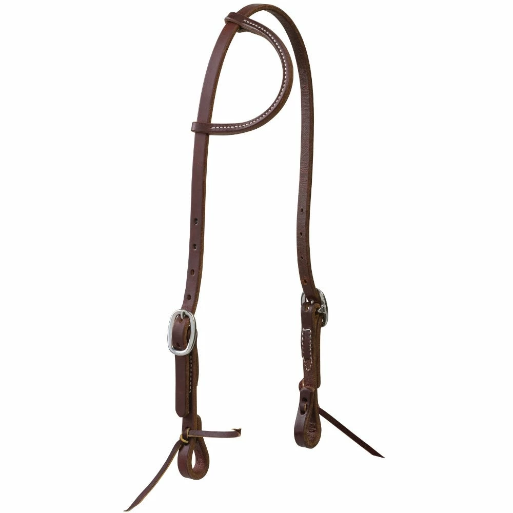 Extra heavy harness leather is dipped in oil, dressed with butter and hand rubbed for the ultimate in performance and a rich golden chestnut color. This easy-to-position 5/8″ sliding ear headstall features lower buckle placement for your horse’s comfort. Ideal for trail, working, and everyday use. Ties at bit ends. Non-rust stainless steel hardware.